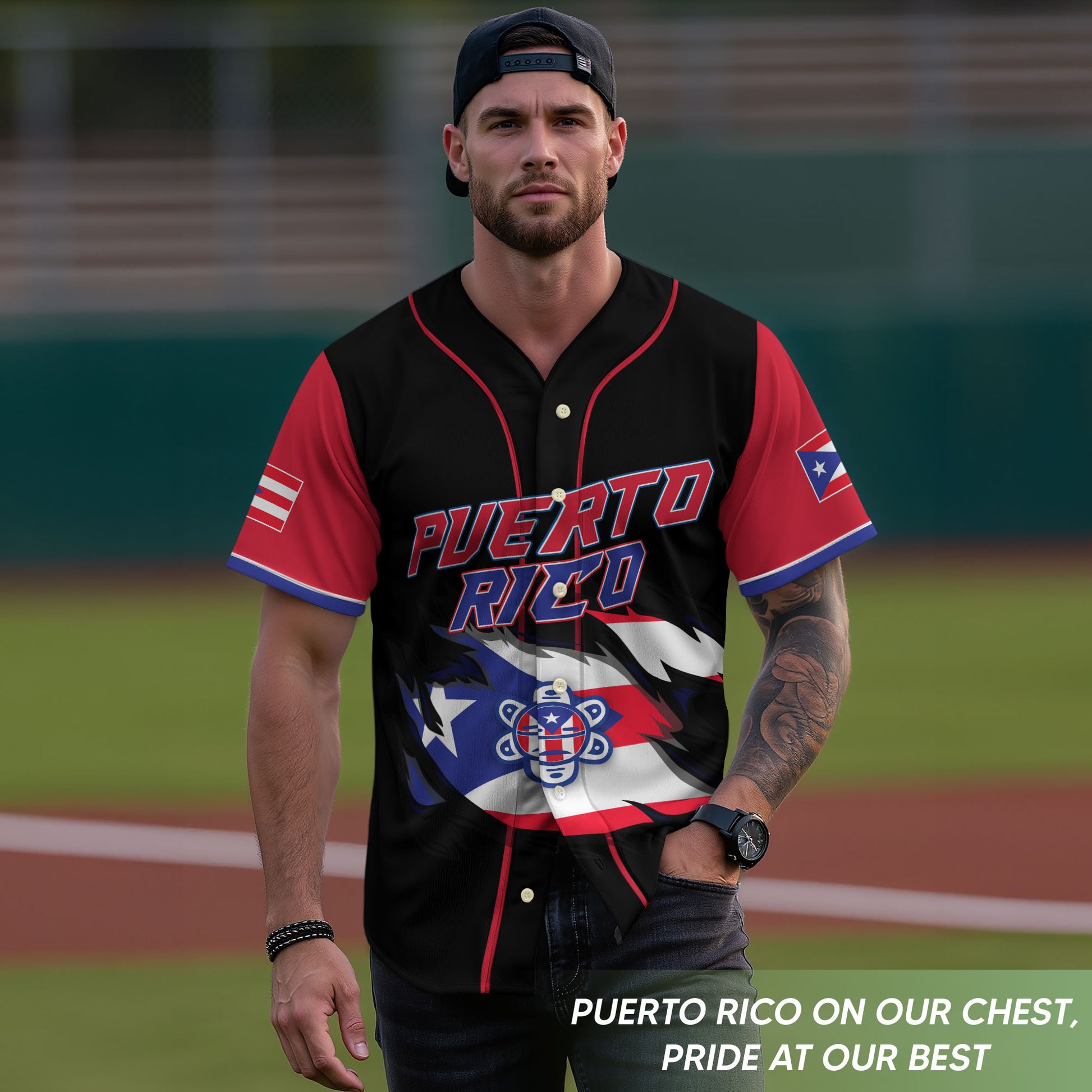 This Puerto Rico Boricua baseball jersey showcases bold black and red torn flag elements paired with the iconic Coquí Frog, symbolizing resilience and island pride. Designed for comfort and everyday versatility, it’s perfect for casual wear, cultural events, game days, or making a strong statement of Boricua identity.