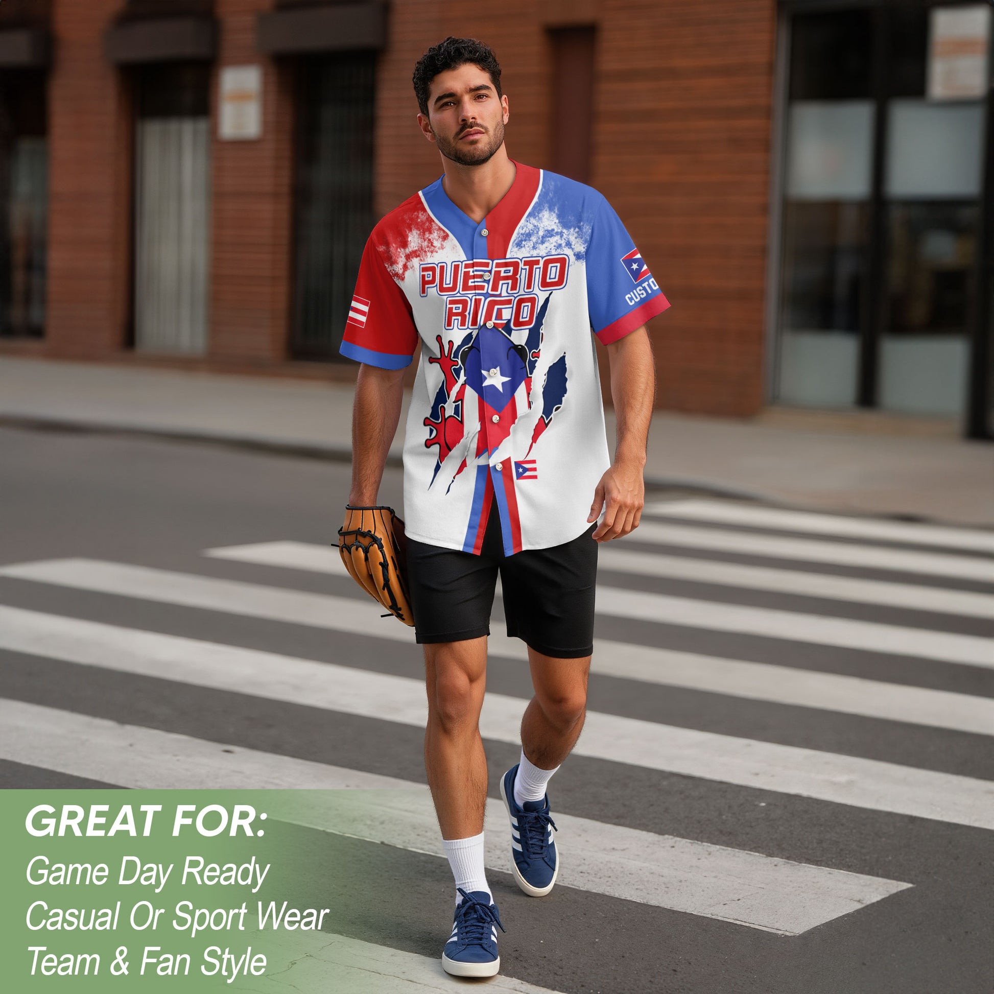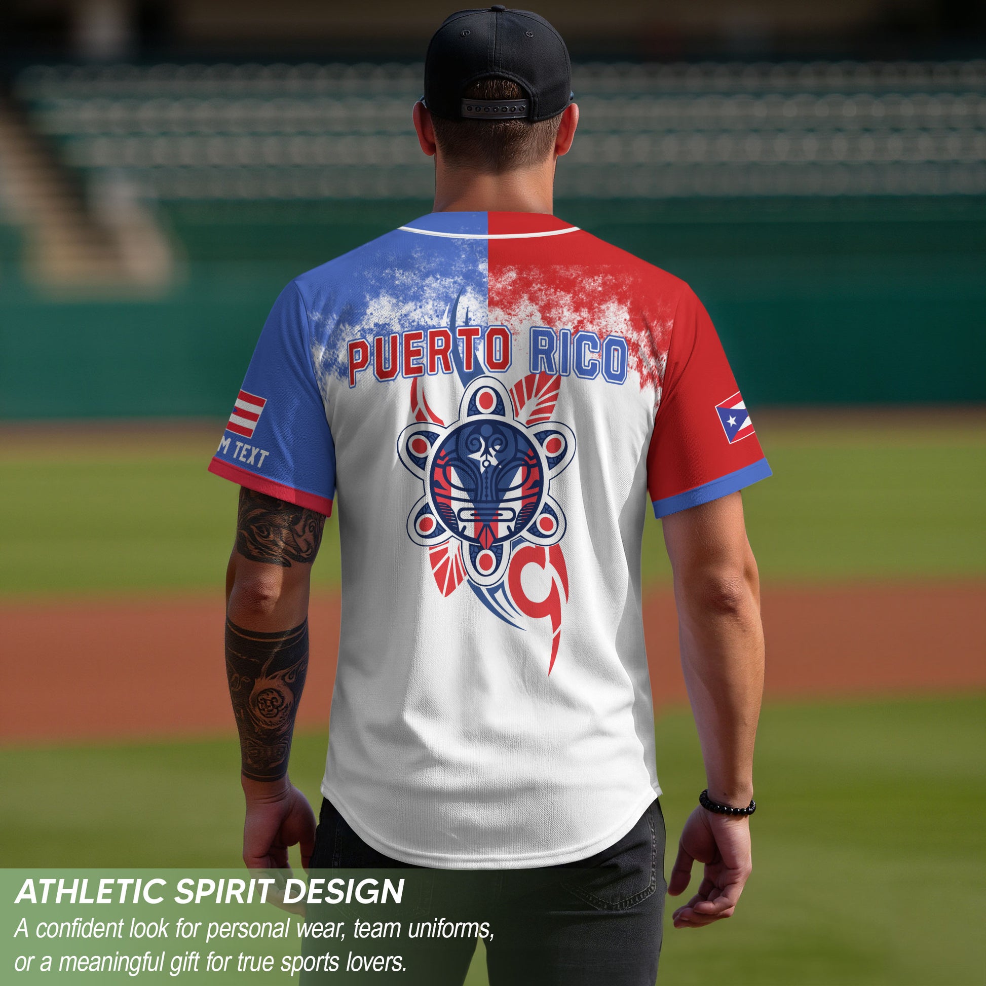 This baseball jersey combines Puerto Rico flag colors with a dynamic paint splatter graphic for a bold, artistic look. Designed for comfort and everyday use, it’s perfect for casual wear, cultural celebrations, or expressing pride in Puerto Rican heritage.