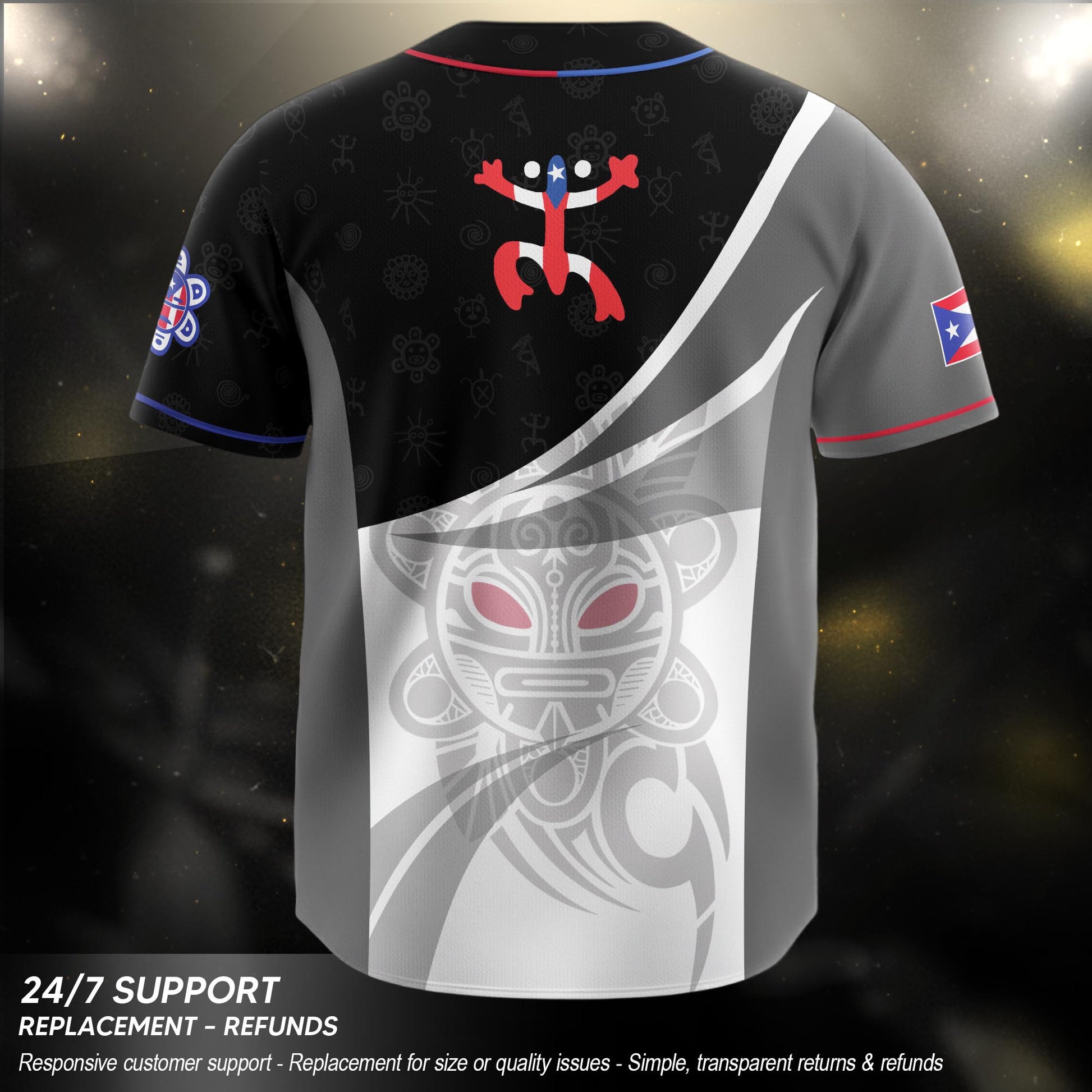 This Puerto Rico Boricua baseball jersey features a graphic design with a historic fortress and Coquí Frog, representing strength and island pride. Designed for comfort and easy styling, it’s suitable for casual outings, community events, or game days.