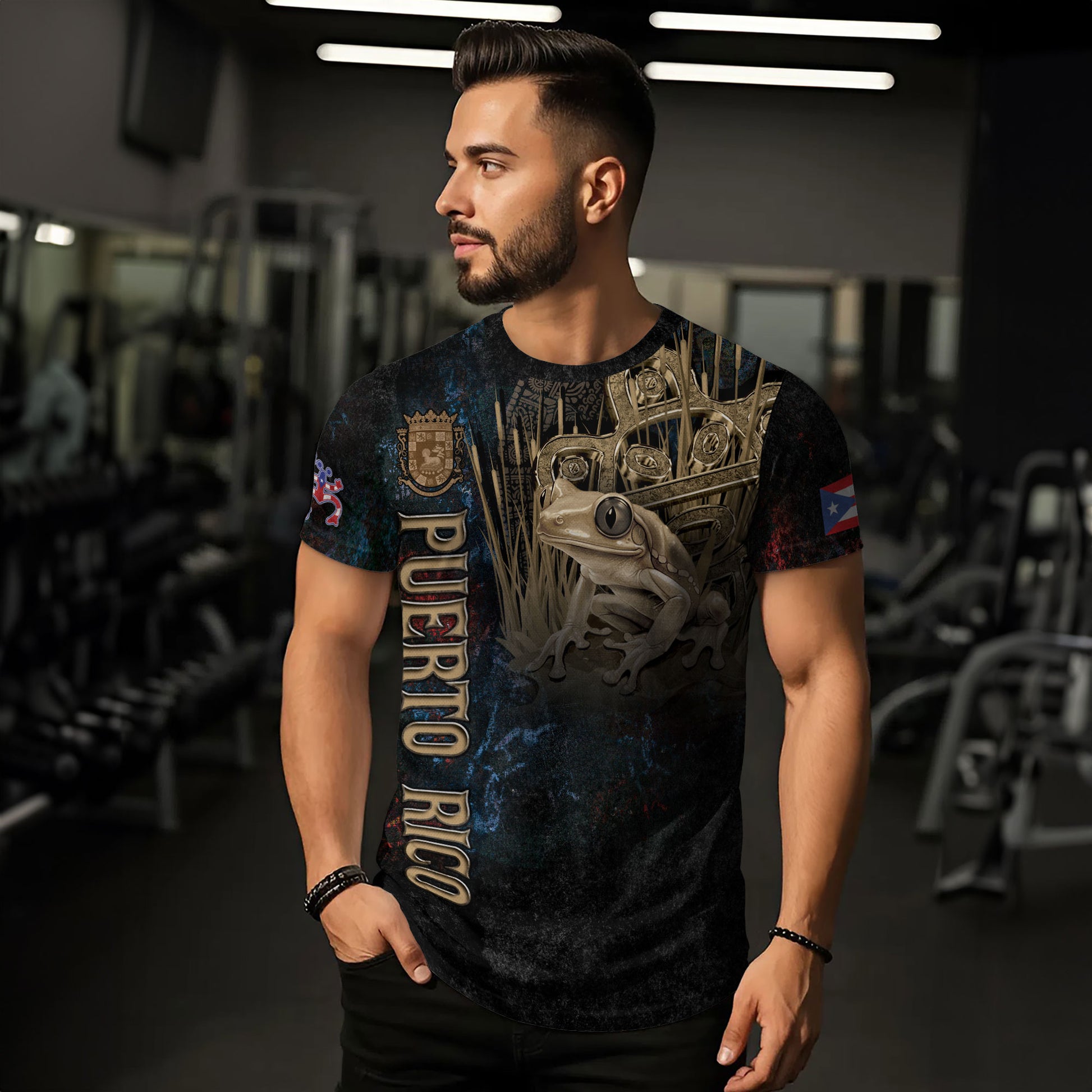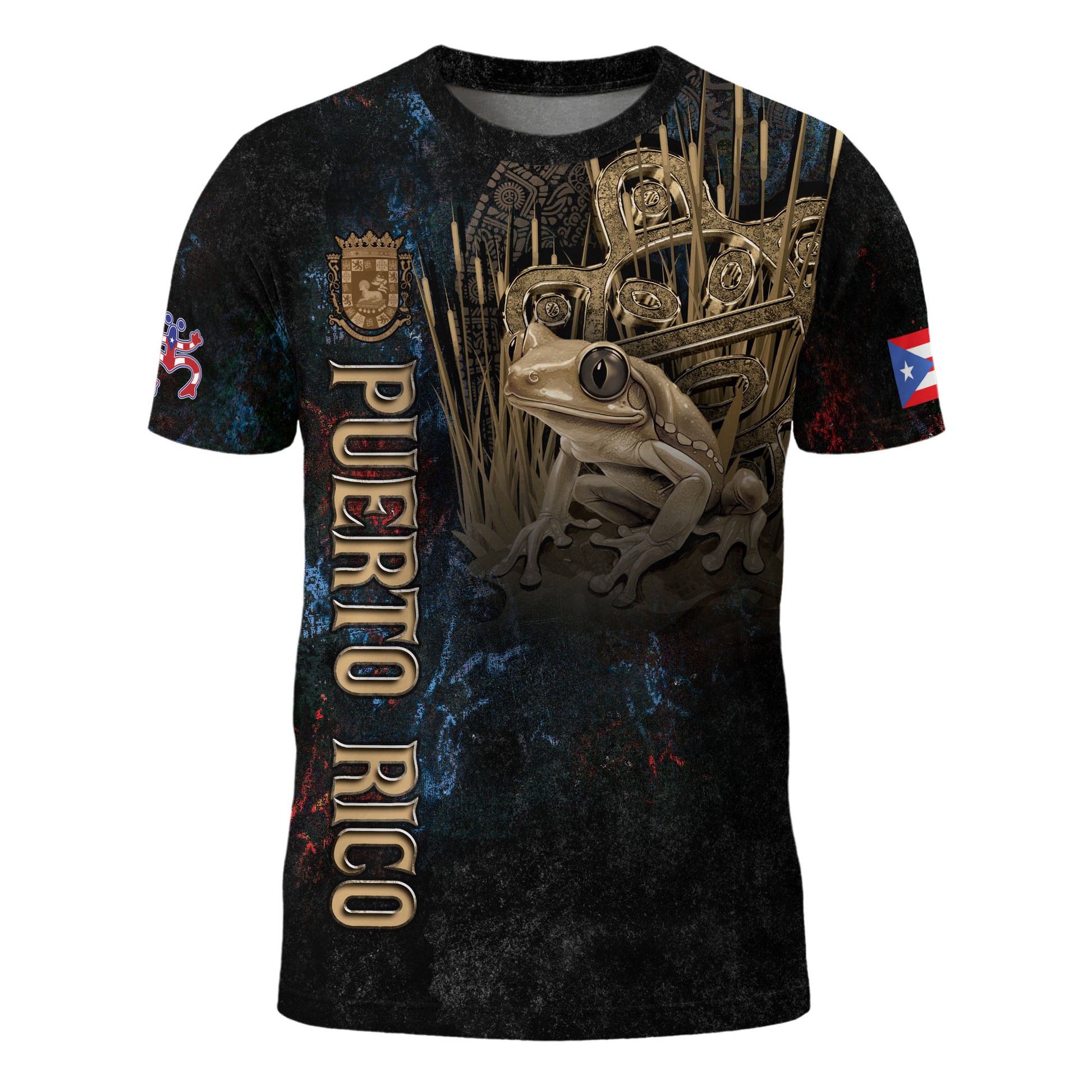 Puerto Rico Coqui Frog Taino Heritage Boricua Pride Gold Emblem Black Shirt