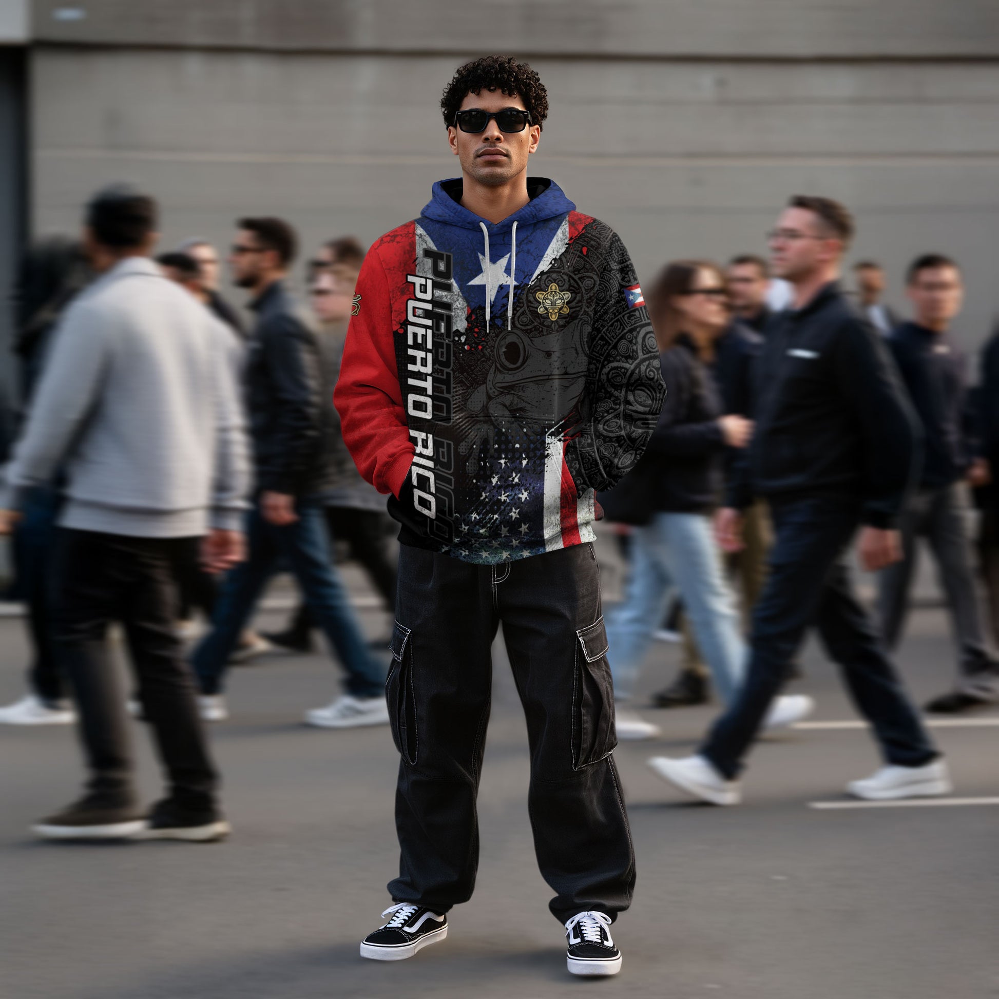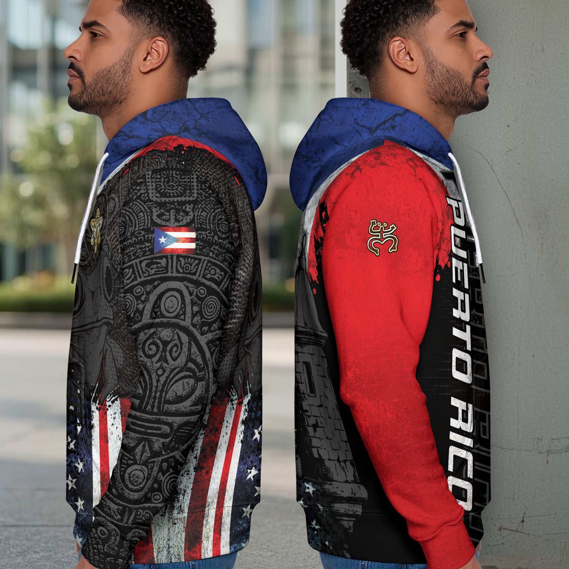 Puerto Rico Flag Coqui Frog El Morro Boricua Tribal Black Red Blue Heritage Hoodie