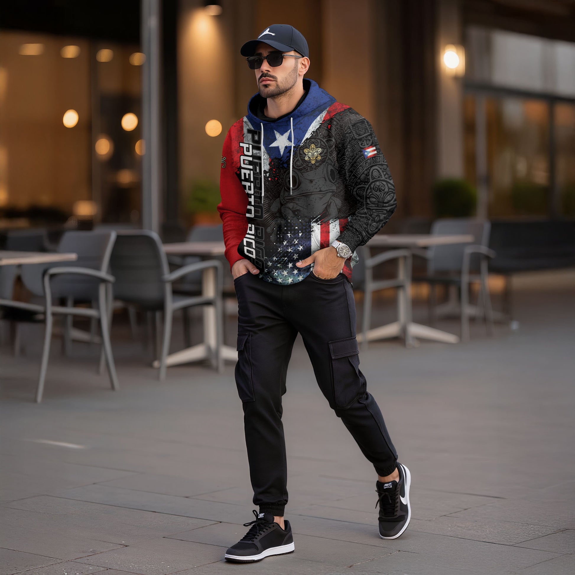 Show national pride with this Men’s Hoodie featuring the Puerto Rico flag, Coquí frog, and El Morro landmark in a bold tribal design. Made for warmth and comfort, it is ideal for casual outings, events, and everyday wear.