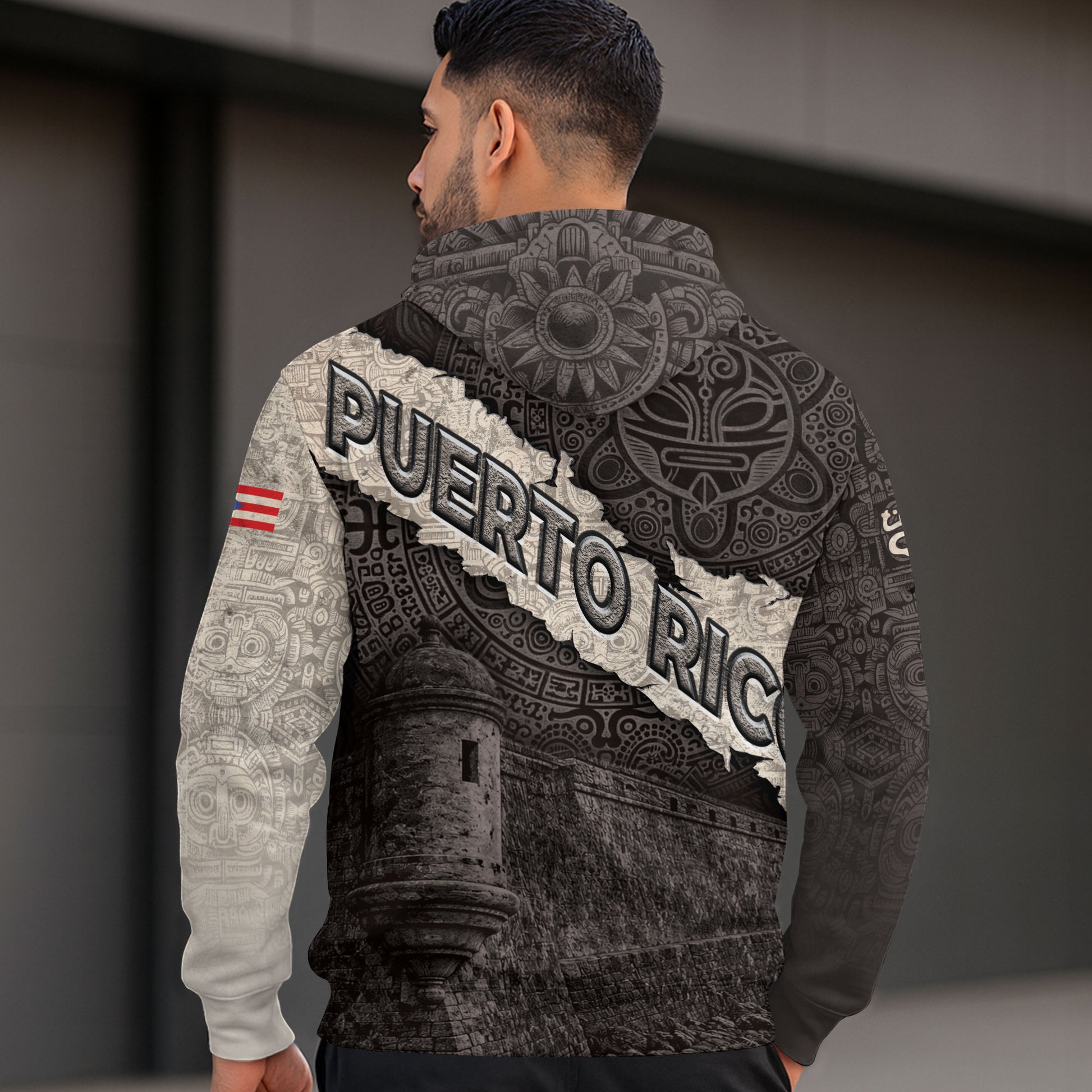 Puerto Rico Map Boricua Coqui Frog El Morro Taino Tribal Beige Gray Hoodie