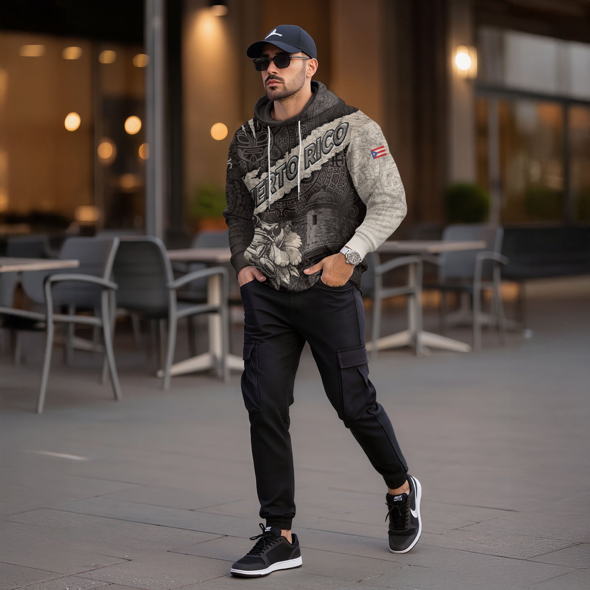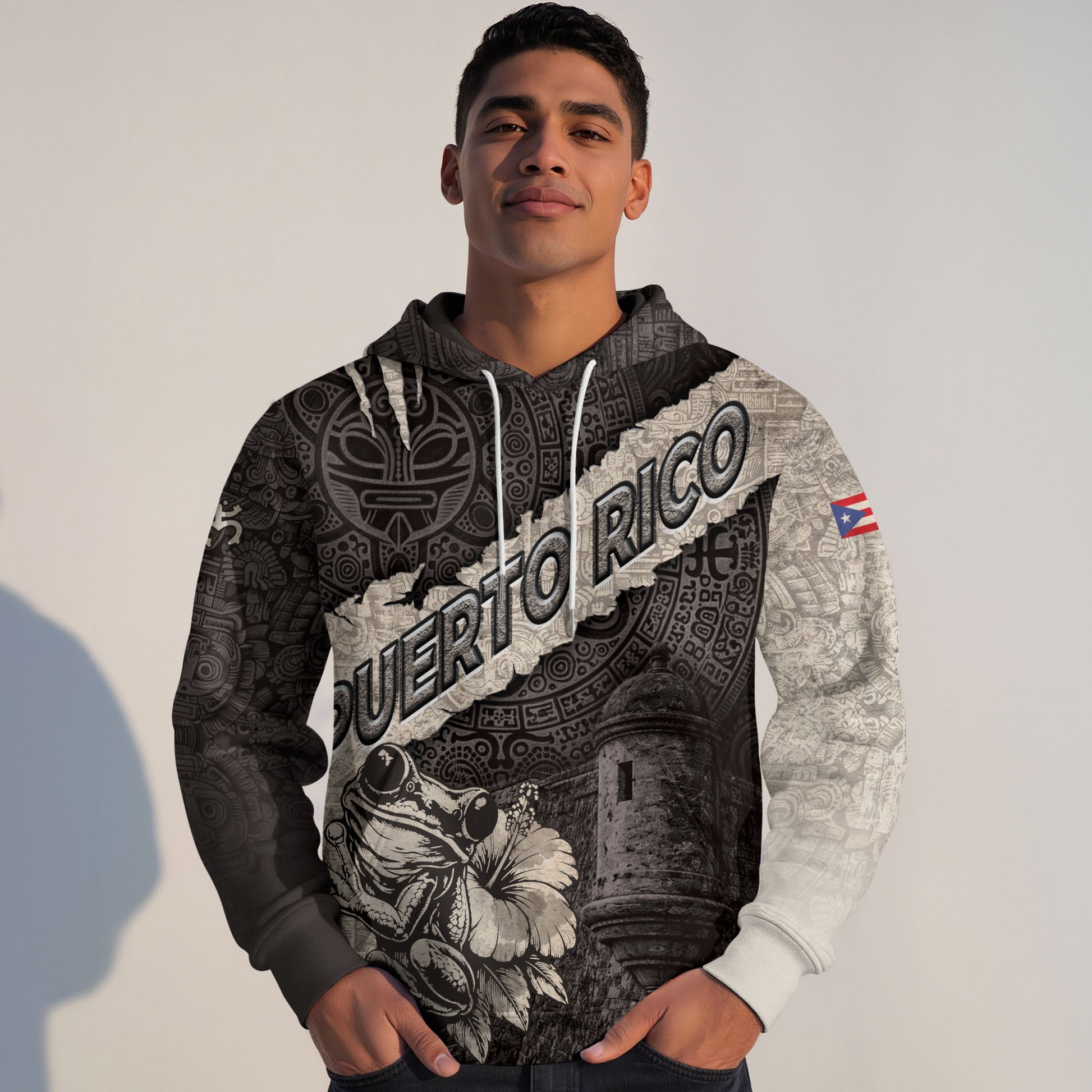 Celebrate Puerto Rican heritage with this Hoodie highlighting the coquí frog and El Morro inspired by Taíno tradition and national history. Made from high-quality fabric that is soft, warm, and comfortable, it offers all-day coziness for casual wear and outdoor activities.