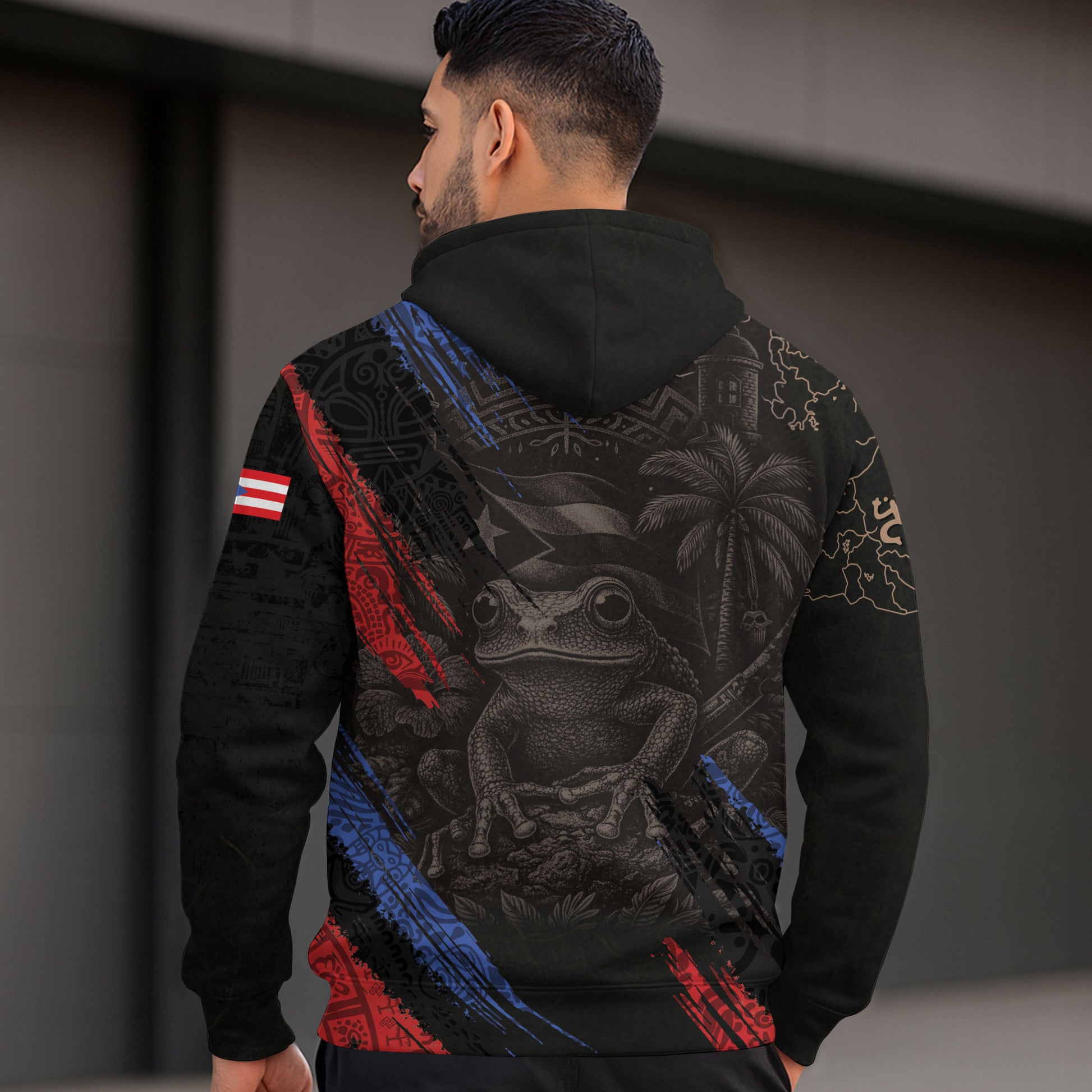 Puerto Rico Map Boricua Coqui Frog Taino Tribal Black Red Blue Heritage Hoodie